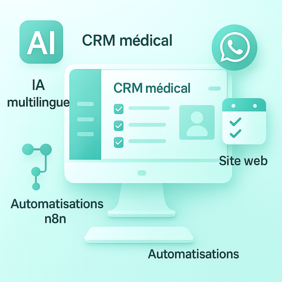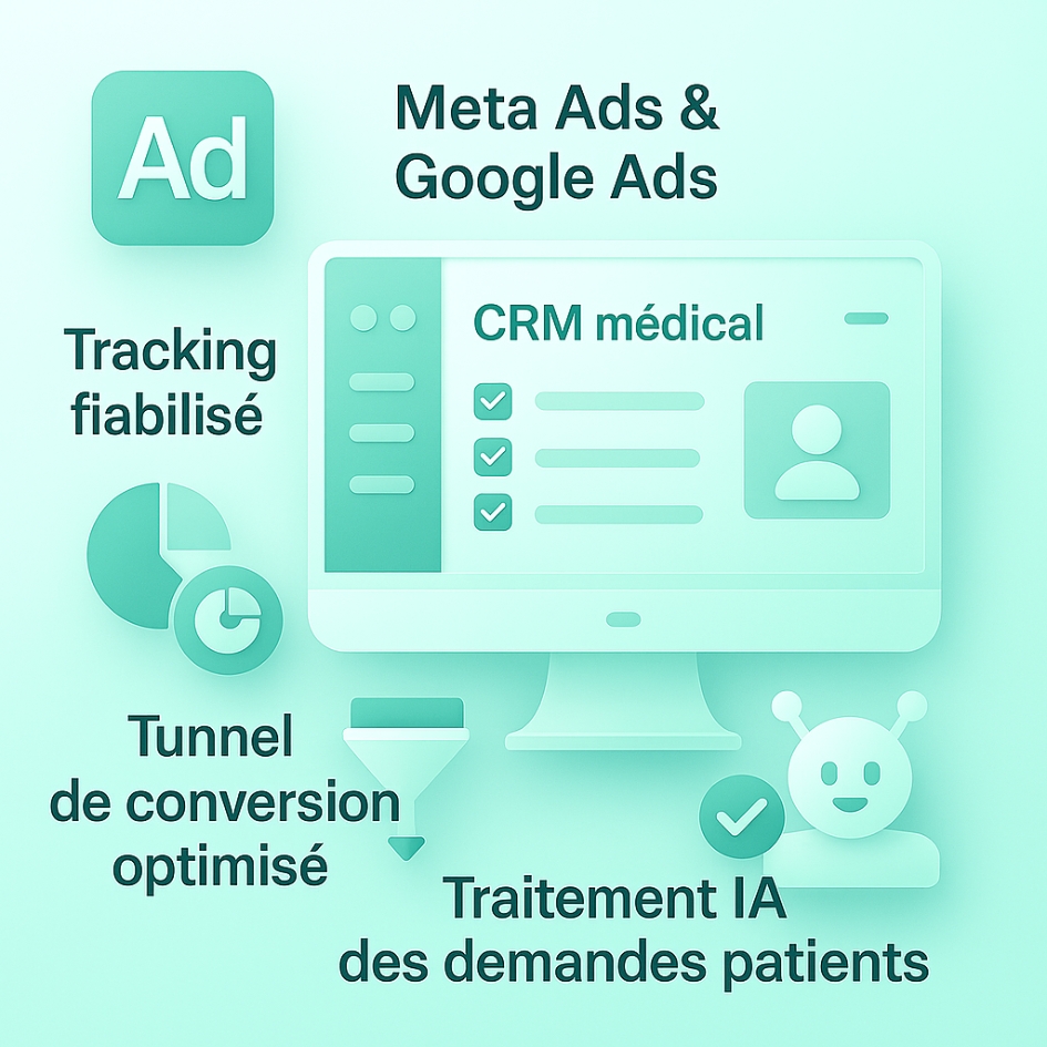 publicité sur Meta et Google, CRM médical, intelligence artificielle multilingue, workflows automatisés, systèmes de prise de rendez-vous et site web à haute performance de conversion.