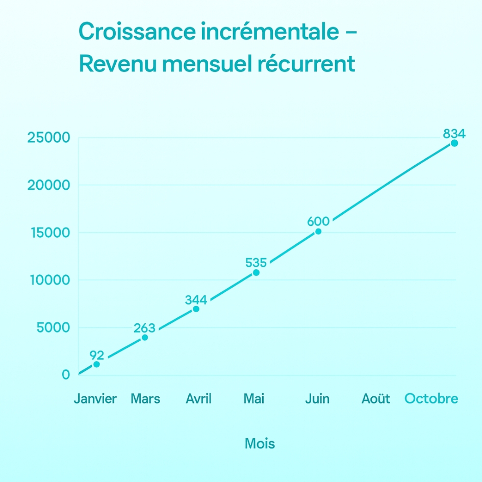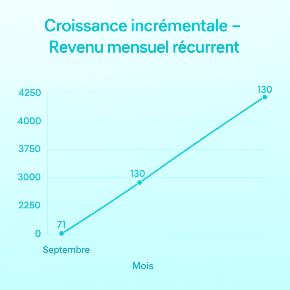 Chaque nouvelle inscription s’ajoute au total cumulé, générant des revenus mensuels récurrents qui augmentent de manière continue dès le lancement de la campagne.